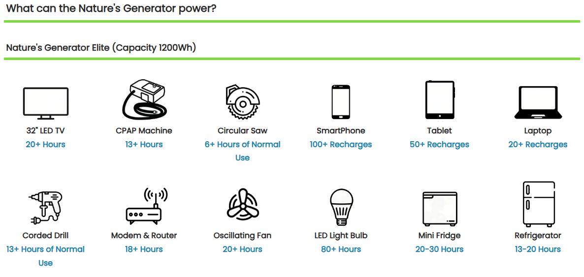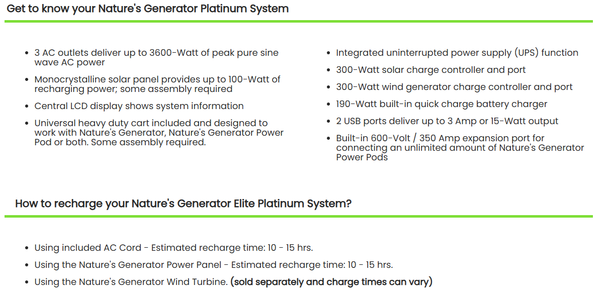 - Versatile Power Solution: The Nature's Generator Elite is a 3600 watt generator that serves as an ideal solution for home battery backup, camping, RV’s, and off-grid setup.